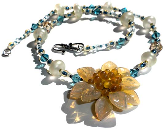 My younger child is now two years old, so I am starting to feel like I can wear jewelry again, without someone trying to pull it off me, or chew on it, or worse. I made this necklace for myself, using the Lotus Flower Pendant Pattern. The beads include Swarovski crystals, hand made lampwork and seed beads. I wish I knew where I got the leaf daggers that I used in the flower. |