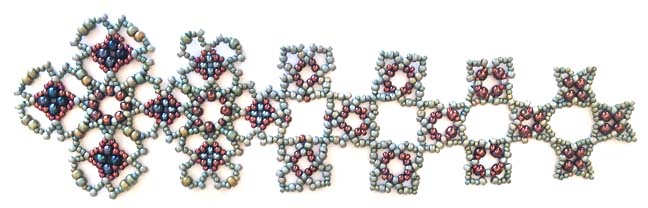 pattern to another. This beadwork design begins as Night Sky weave on the left and deforms gradually to Kepler's Star in the right. You can see