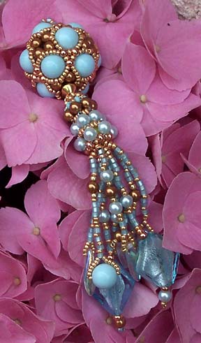 by Bernadette Ajdari Pompertuzat, France Bernadette used a variation on the Octahedral Cluster pattern to make this charm with blue porcelain and Swarovski pearls. |