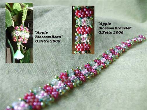 Extertal, Germany Gunhild made our Apple Blossom Bead from the instructions published in the April 2006 issue of Bead & Button Magazine. She then came up with her own bracelet design to match, and generously named it after Florence. We have since licensed Gunhild to sell her instructions for the Apple Blossom Beaded Bead on her web site (in German). See more of Gunhild's beadwork on her website www.gunhildfette.de. |