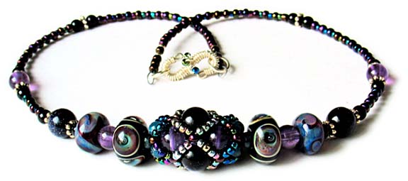 by Gwen Fisher This necklace features the Cosmic Gemstones Diamond Net Bead, made with blue goldstone, blue-green apatite, and amethyst. The four borosilicate glass beads were made by Julio Wray and Kristan Child of Redside Designs. Length: 15.75 inches (adjustable with ribbon) |